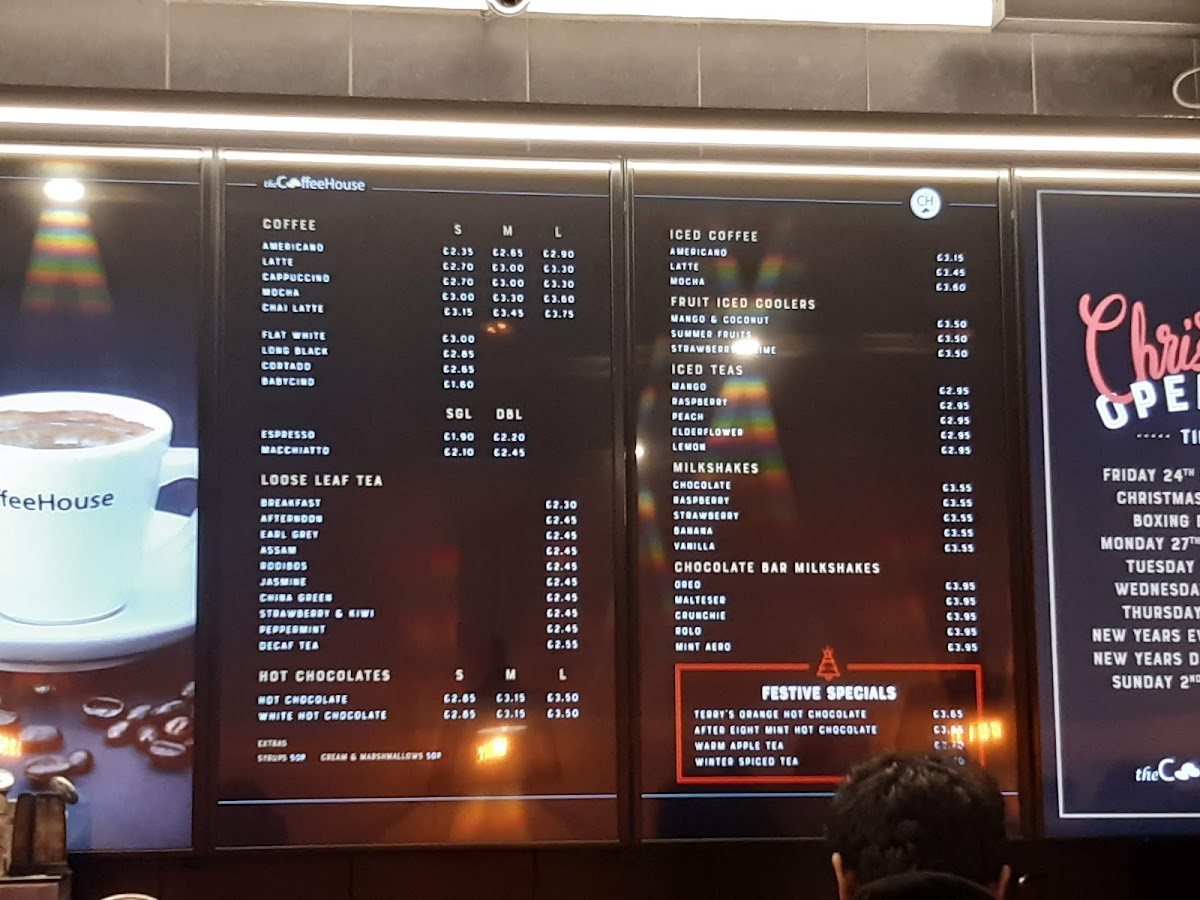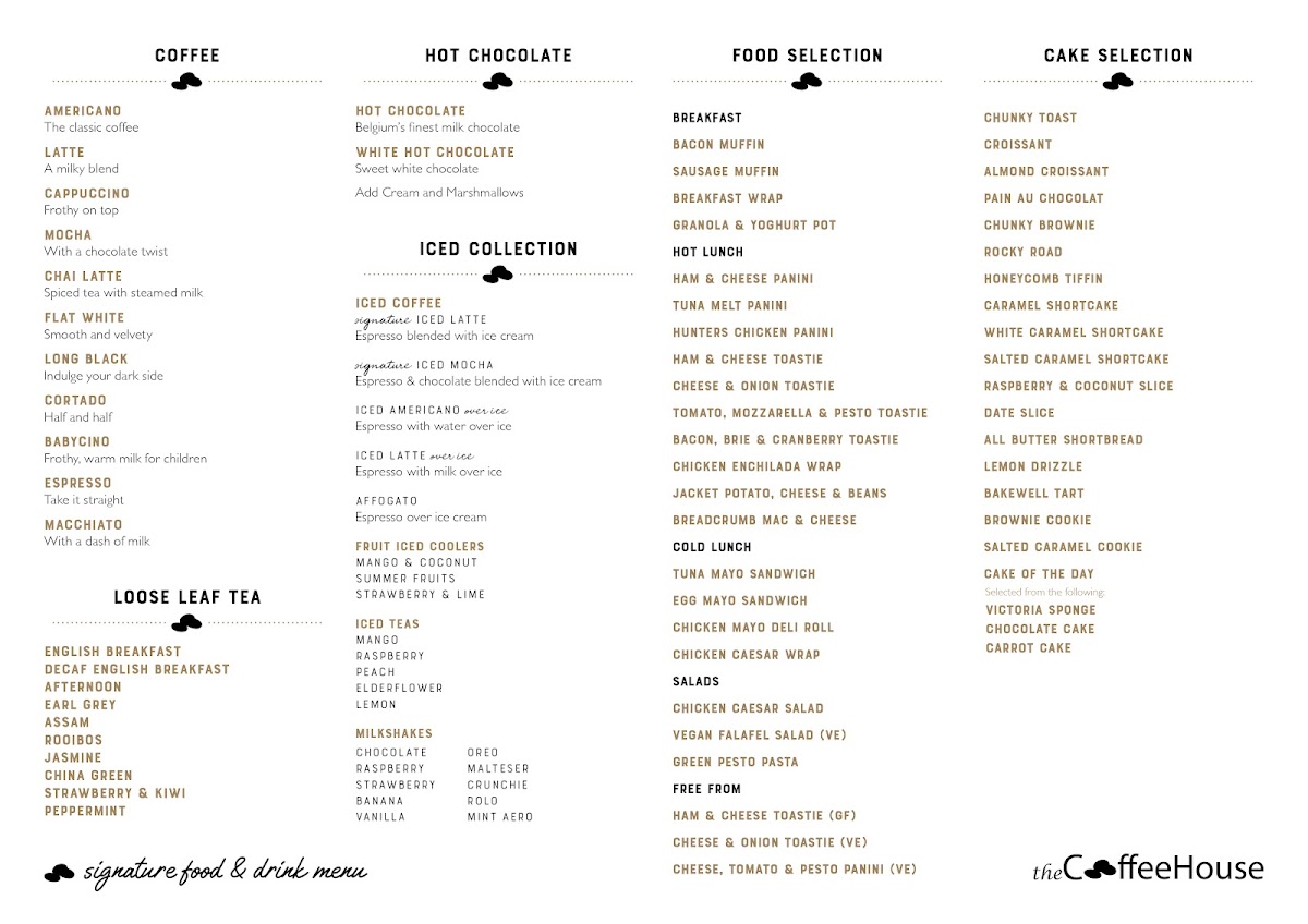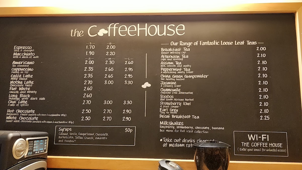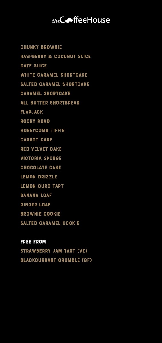 From a reviewer’s perspective, the menu at The Coffee House Sale offers a well-rounded and comforting selection that covers everything from classic drinks to satisfying light meals and sweet treats. The coffee selection includes favourites like Americano, Latte, Cappuccino, Mocha, and Chai Latte, while tea lovers can enjoy English Breakfast, Earl Grey, and Assam from the loose leaf range. For something indulgent, there’s Hot Chocolate and White Hot Chocolate, alongside iced options such as Iced Coffee and Signature Iced Latte. The food menu is simple but appealing, featuring breakfast items like Bacon Muffin and Granola & Yoghurt Pot, hot lunches such as Ham & Cheese Panini and Tuna Melt Panini, and lighter choices like Chicken Caesar Wrap and Vegan Falafel Salad. The cake and pastry selection, including Almond Croissant, Pain Au Chocolat, and Chunky Brownie, nicely rounds off the menu, making it a pleasant spot for both a quick coffee stop or a relaxed lunch.